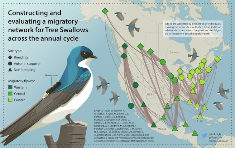 When we analyzed the network, we discovered that tree swallows migrated between their breeding and wintering grounds using three distinct migratory flyways: west of the Rocky Mountains, down the Mississippi River valley and along the Atlantic coast. Breeding populations within these flyways mixed extensively with one another at migration stopover and wintering regions.