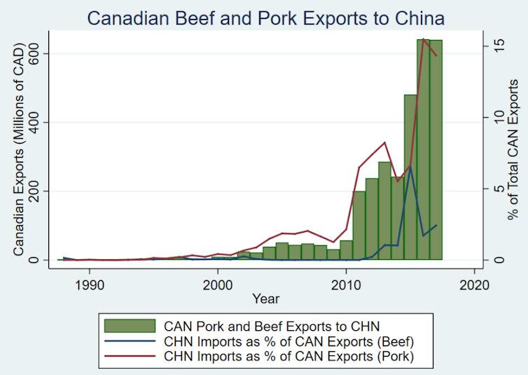 Chinese consumers have provided much-needed demand for Canadian exporters. Exports have helped to maintain Canadian farm income and increase profit margins. So the current Chinese suspension of Canadian meat imports will increase financial risk and uncertainty for the Canadian beef and pork industries.