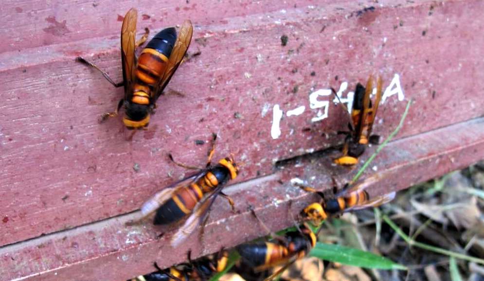 Yellow-legged hornets (Vespa velutina) typically hover outside the hive and pick off returning forager bees. Giant hornets (Vespa soror in Vietnam) pose a greater threat. After finding a colony of bees or other social wasps, they recruit their nestmates to slaughter many of the adults. The hornets then occupy the nest and harvest the grubs and pupae to feed their own developing larvae.