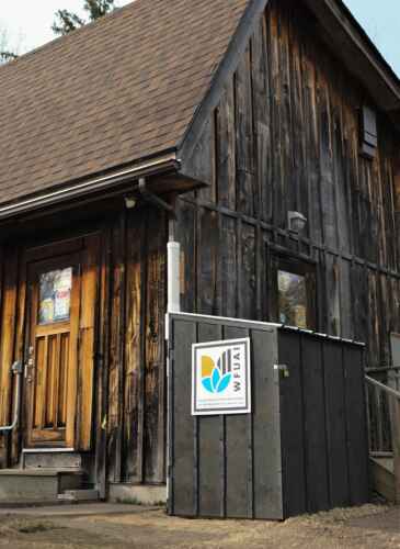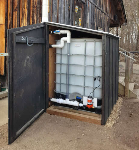 Housed inside a wooden enclosure, the plastic, 1,000-litre demonstration tank at the nature centre is fed by eavestrough downspouts from a roof that was originally intended to accommodate solar panels. Those panels were never installed.