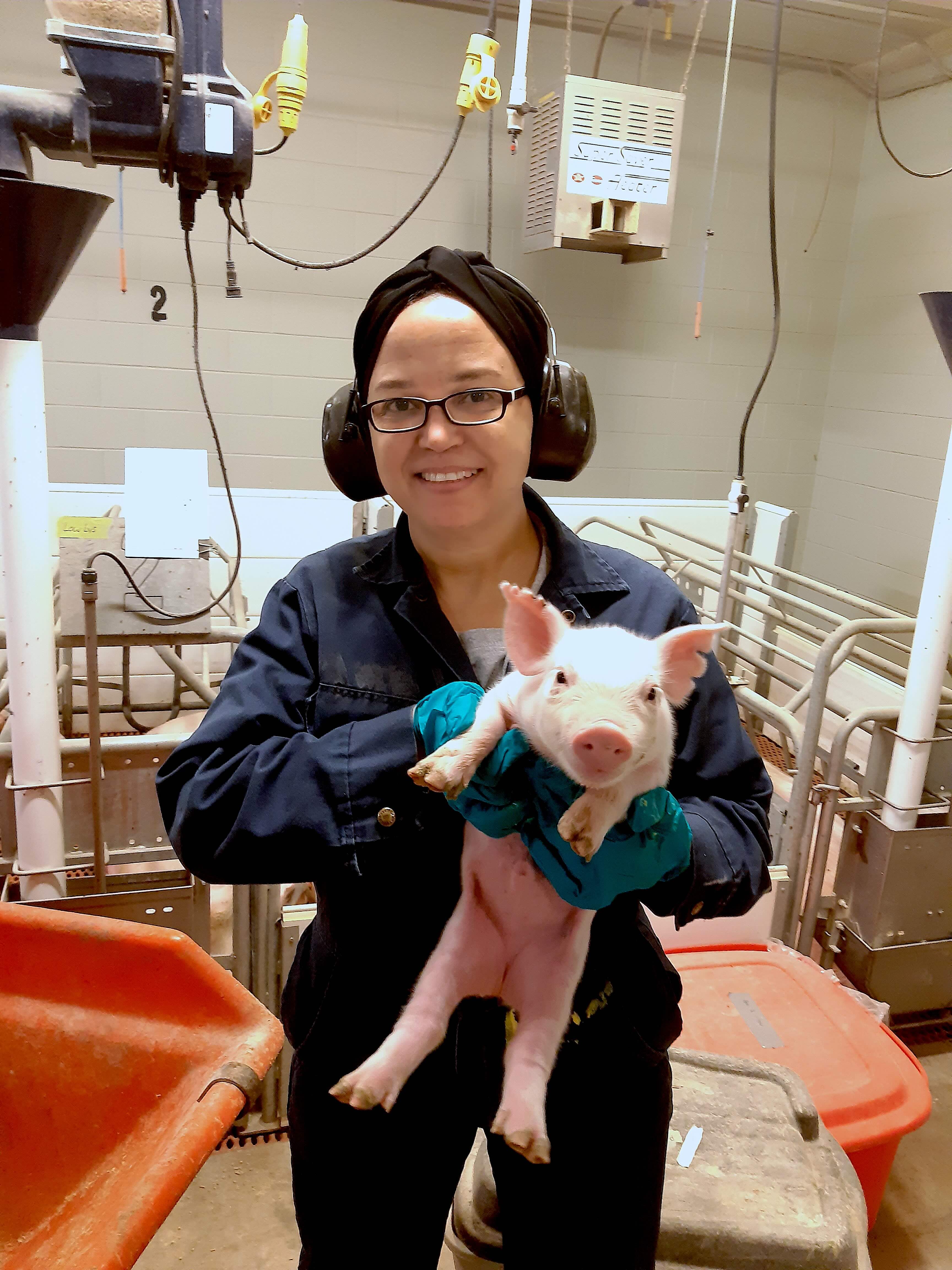 Maysa Niazy smiling in a navy blue lab suit and head covering holds a piglet in an animal research facility. She wears large earmuffs and teal gloves, standing among feeding equipment and pens in the brightly lit lab environment.